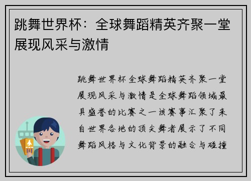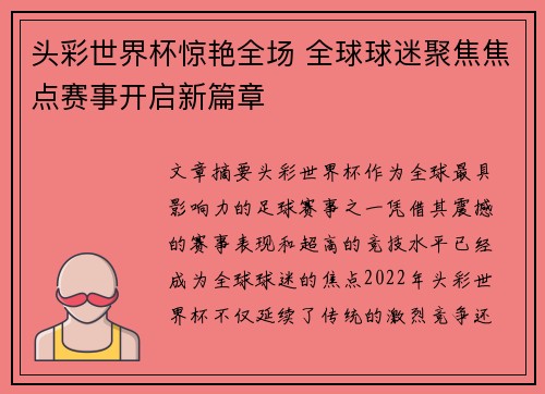 文章摘要:首脑世界杯作为全球智力与战略的顶尖对决,汇聚了来自世界各地的精英选手。这一赛事不仅仅是对参赛者智力的挑战,更是一场策略与心理博弈的较量。通过深入分析赛事的组织结构、参赛者的技能要求、心理因素以及赛事的影响力等方面,我们可以全面了解这一智力竞技盛宴。首先,赛事的组织与规则设定为选手提供了一个公平而又充满挑战的舞台;其次,顶尖选手的选拔和准备过程展现了赛事的严谨性和高水平;再者,心理素质在决...
