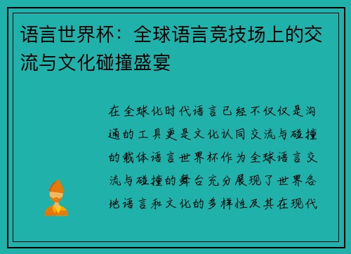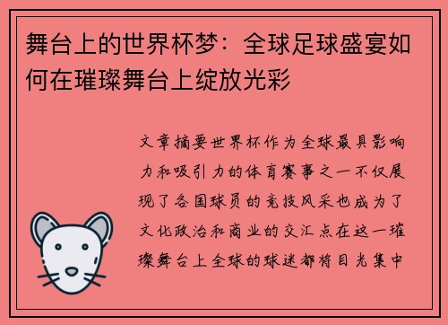 世界杯作为全球最为盛大的体育盛宴之一,每四年举办一次,它不仅是足球运动的巅峰赛事,更是世界各地文化交流的广阔平台。在这一赛事中,来自世界各地的球员们代表着各自国家的荣誉,而数以亿计的球迷们则共同见证着荣耀与梦想的碰撞。本文将从四个方面探讨璀璨世界杯盛宴如何点燃四海之情,如何见证历史与荣耀的交织,以及梦想在足球场上如何实现与碰撞。从球迷文化、世界杯对世界经济的影响、足球赛场上的英雄崛起到科学研究对世...